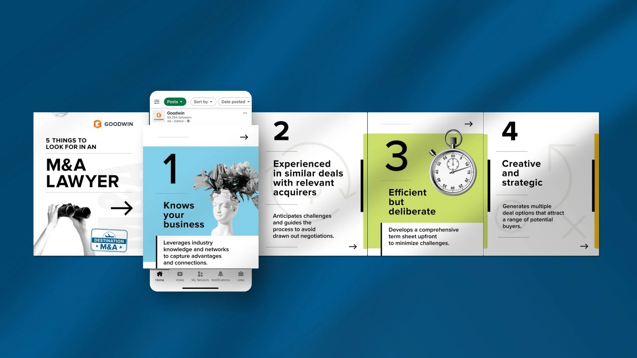 Created as a LinkedIn campaign for Goodwin’s M&A group, this project used a travel-poster–inspired concept and ticket motif to frame deal activity as purposeful destinations, supported by a flexible system of templates and assets.